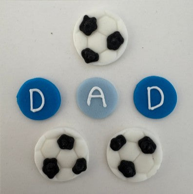 Each pack includes 3x Football sugar toppers and 3x 'DAD' initial sugar toppers. A simple decorating solution to add a professional finish to celebration cakes. Perfect for fathers day!