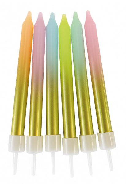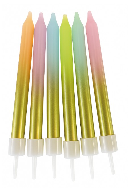 - Pink, orange, yellow, green, blue and lilac with gold ombre candles