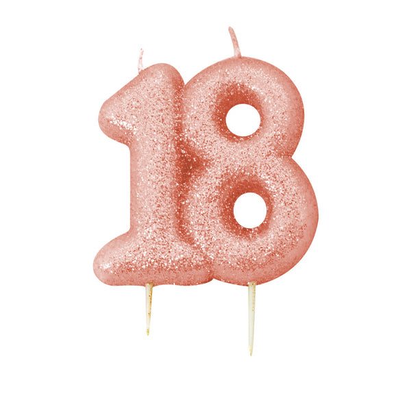 Make a wish on this gorgeous number 18 rose gold glitter candle! The contemporary font and rose gold glitter finish create an eye-catching custom cake topper.